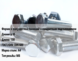 Болт с полукруглой головкой и квадратным подголовником 8х130 DIN 603 Сталь: А4 М8, цену уточнять, кг цена от 15.3 ₽ / кг, где купить, условия доставки в Иркутске и Иркутской области