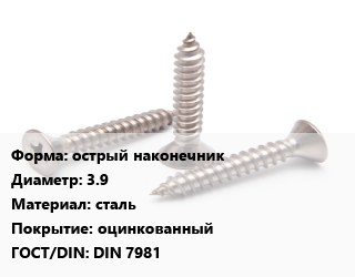 Саморез острый наконечник D=3.9 сталь оцинкованный ГОСТ: DIN 7981