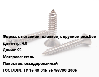 Саморез с потайной головкой, с крупной резьбой D=4.8 L=95 сталь оксидированный ГОСТ: ТУ 16 40-015-55798700-2006