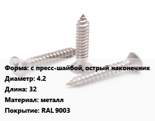 Саморез с пресс-шайбой, острый наконечник D=4.2 L=32 металл RAL 9003, упаковка 500 шт цена от 360.92 ₽ / кг, где купить, условия доставки в Иркутске и Иркутской области