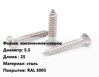 Саморез наконечник-сверло D=5.5 L=25 сталь RAL 3005, упаковка 420 шт цена от 1 233 ₽ / кг, где купить, условия доставки в Иркутске и Иркутской области