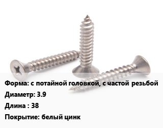 Саморез с потайной головкой, с частой резьбой D=3.9 L=38 белый цинк, кг цена По запросу где купить, условия доставки в Иркутске и Иркутской области