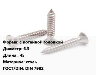 Саморез с потайной головкой D=6.3 L=45 сталь ГОСТ: DIN 7982, упаковка 1000 шт цена от 1 902 ₽ / кг, где купить, условия доставки в Иркутске и Иркутской области