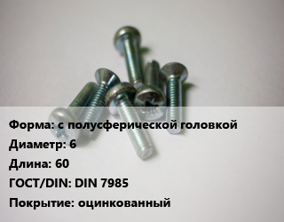 Винт с полусферической головкой 6х60 DIN 7985 оцинкованный, цена за 1000 шт,цена за шт, кг цена от 2.66 ₽ / кг, где купить, условия доставки в Иркутске и Иркутской области