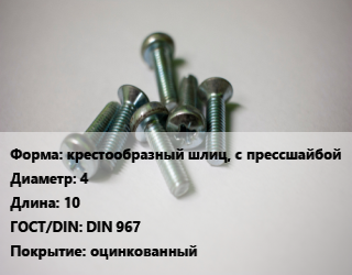 Винт крестообразный шлиц, с прессшайбой 4х10 DIN 967 оцинкованный