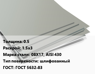 Лист нержавеющий 0.5 1.5х3 Сталь: 08Х17, AISI 430 Тип:шлифованный ГОСТ 5632-83