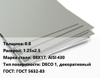 Лист нержавеющий 0.8 1.25х2.5 Сталь: 08Х17, AISI 430 Тип:DECO 1, декоративный ГОСТ 5632-83, х/к, в пленке цена от 193 256 ₽ / т, где купить, условия доставки в Иркутске и Иркутской области
