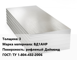 Алюминиевый лист 3 Марка: ВД1АНР рифленый Даймонд ГОСТ: ТУ 1-804-432-2006 цена от 438 300 ₽ / т, где купить, условия доставки в Иркутске и Иркутской области